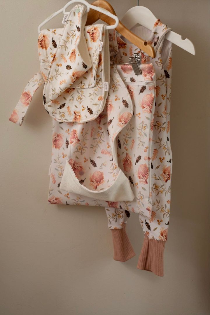 Handmade baby gift bundle. Proteas and Wattle fabric designed by Australian Artist Fill Hill Farm. Fabric sourced from small Australian businesses.