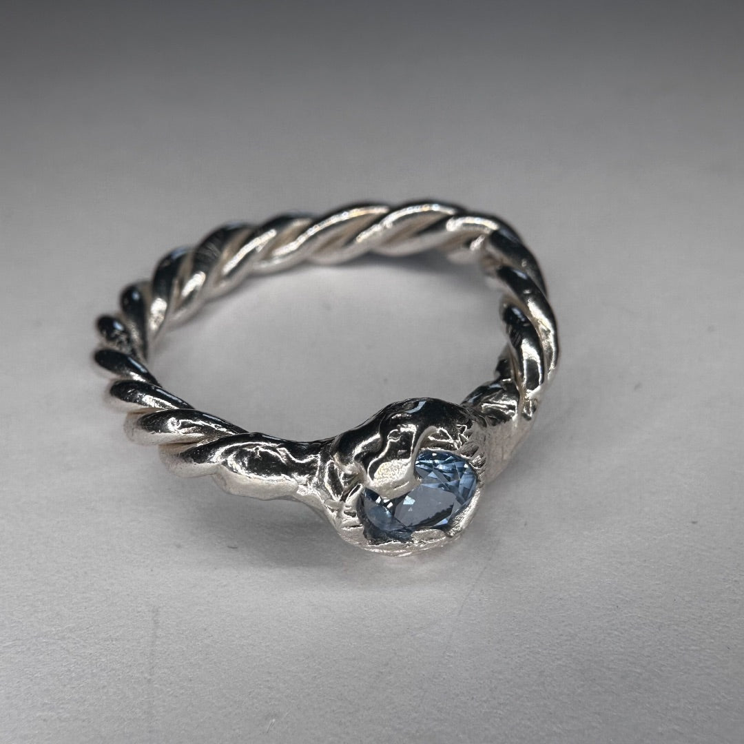 A sterling silver twisted ring with a natural Aquamarine gemstone